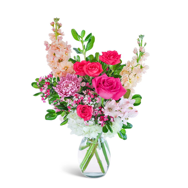 Experience the captivating beauty of Strawberry Sunrise Bouquet, a floral design that harmoniously combines light pink and bright pink flowers, including roses, hydrangeas, mums, carnations, and premium foliage. Set in a clear glass vase, this arrangement effortlessly merges bold and pastel hues, creating a stunning gift that will surely impress. Our floral inventory changes with the seasons and market availability. These images are indicative of our general size & style. We can offer same-day flower delivery in most cases. If you are sending the bouquet directly to your recipient, please provide the complete address and contact information so that we can deliver the flowers directly to them.