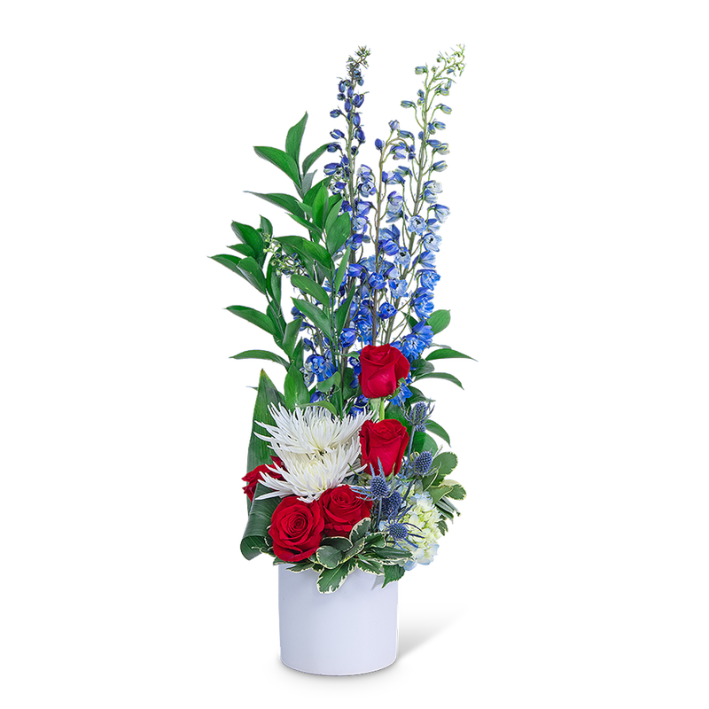 Strength and Courage is a popular choice for flowers for Memorial Day or Independence Day and is beautifully shown in red, white, and blue flowers. This patriotic theme is accomplished with Roses, Hydrangea, Spider Mums, Delphinium, and other premium foliage in a classic white ceramic container. Strength and Courage would also be a beautiful tribute to send for a military funeral or for the funeral of a veteran.