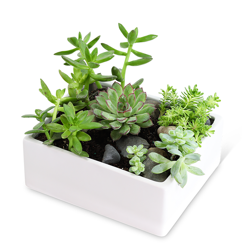 Succulent gardens are all the rage and very popular, and for good reason! They are low-maintenance, modern and stunningly beautiful. Let us create an artful combination of succulents in a succulent garden that will last for many months or even years of enjoyment. Our succulent garden will look great on a desk or coffee table and is beautifully arranged in a clean, modern container.