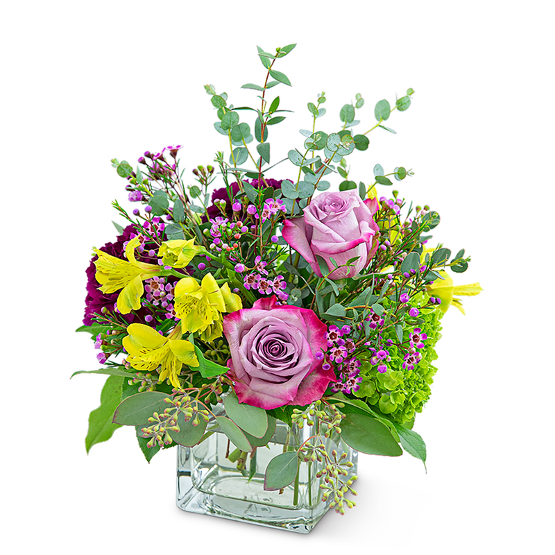 Are you wanting to send a sweet sentiment or gift? Our Sugar and Plum design features long-lasting Alstroemeria, purple carnations and roses, hydrangea, premium foliage, and wax flower accents. Sugar and Plum is a lovely way to send your love and appreciation! It will be the perfect complement to a home or office and will look stunning on a side table or desk.