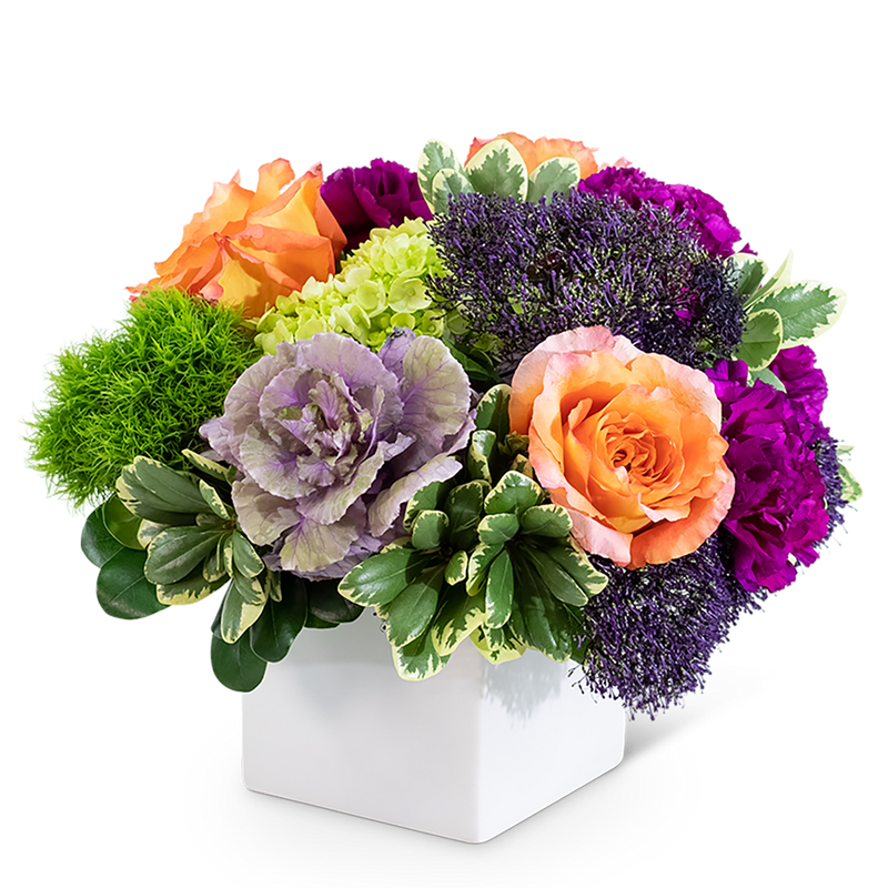 Our Sun and Reign flower bouquet is a stunning gift for any occasion and is a very popular choice! This elegant and clean design features deep purple carnation, Free Spirit roses, purple kale, mini green hydrangea, green trick dianthus, trichilium, pittosporum, and aralia leaf. It's the perfect accent for an end table or desk and will brighten any room.