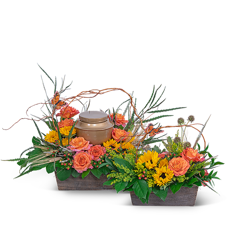 The Sunset Reflections Tribute is a beautiful way to reflect on your loved one's life. Sunflowers represent pure love and adoration, which makes these family flowers the perfect accent to a funeral or celebration of life ceremony. This memorial design features orange roses, bright sunflowers, hypericum berry, and curly willow, all artfully surrounding the urn. This tribute is perfect for cremation services or a Celebration of Life Service to honor your loved one.