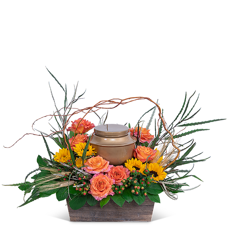The Sunset Tribute is a beautiful way to reflect on your loved one's life. Sunflowers represent pure love and adoration, which makes these family flowers the perfect accent to a funeral or celebration of life ceremony. This memorial design features orange roses, bright sunflowers, hypericum berry, and curly willow, all artfully surrounding the urn. This tribute is perfect for cremation services or a Celebration of Life Service to honor your loved one.