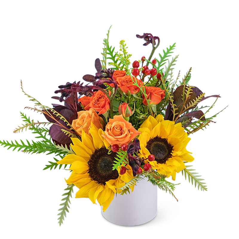 Bring a little sunshine into your day! This sun bright arrangement features roses, sunflowers, kangaroo paw, hypericum berry, solidago, leucodendron, and grevelia. Whether celebrating a birthday, new baby, or retirement, Sunshine Day will add just the right touch of warmth.