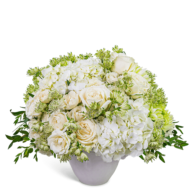 Swan Silk is an elegant blend of White Roses, Hydrangea, and accent flowers designed in a sleek white ceramic vase. This serene arrangement is ideal for weddings, sympathy gestures, or sending timeless beauty just because. Our floral designer may make thoughtful substitutions while maintaining the overall look of the arrangement.
