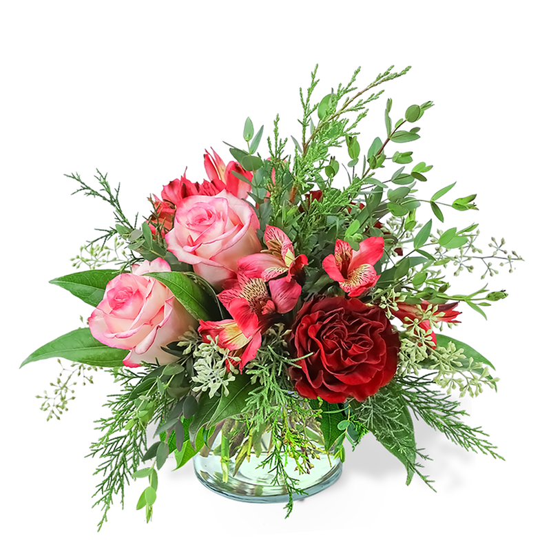 Sweet Cranberry is the perfect winter flower design for your home. It will look nice on any holiday table, with an assortment of roses, Alstroemeria, Eucalyptus, and assorted Evergreen. Sweet Cranberry is a shop favorite, with its rich, warm, cranberry tones.
