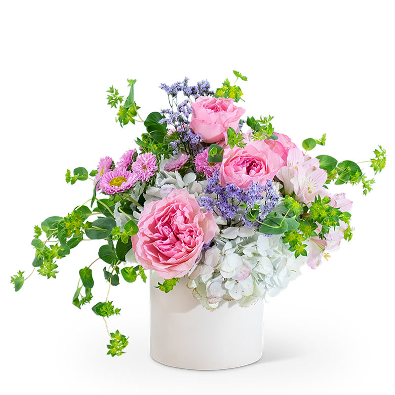 Send your love with this serendipitous design, perfect for a birthday or romantic gift. Sweet Serendipity features pink Myra roses, soft pastel hydrangea, Matsumoto asters, pink alstroemeria, lavender Limonium, and bupleurum for a long-lasting floral experience full of good wishes!