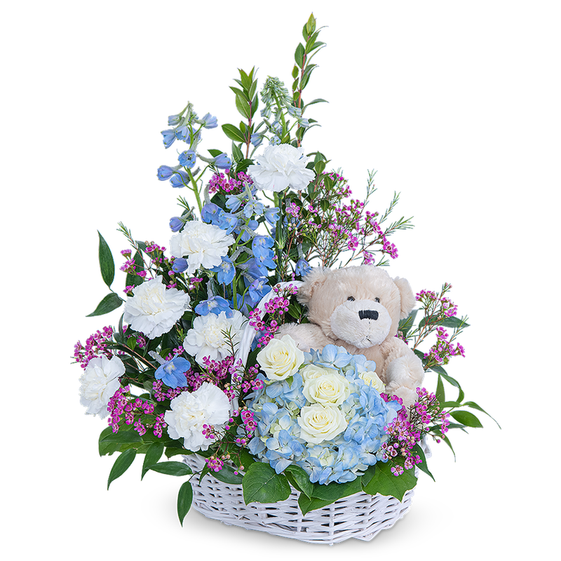 Sweet Solace Basket features spray roses, Carnations, Hydrangea, Delphinium, Waxflower, other premium foliage, and a keepsake stuffed bear tucked sweetly into a classic white basket. Sweet Solace Basket is the perfect sympathy design to send to a funeral or a grieving family to let them know their little angel will be forever remembered.