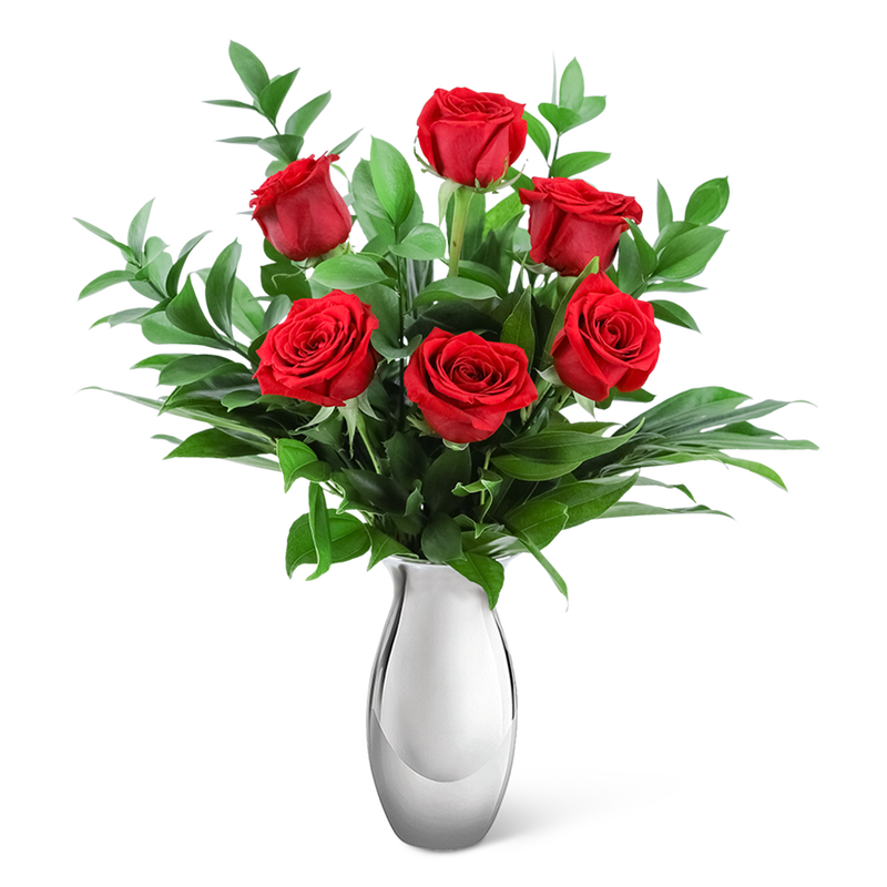 Nothing is more classic than red roses! The Classic Six in Silver contains six premium red roses accented with fresh foliage and lily grass in a silver vase. It will make a beautiful anniversary or just because gift for that special someone