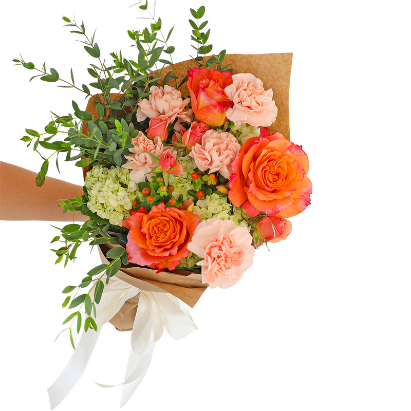 Our Malibu Bouquet features a variety of peach roses, peach carnations, hypericum berries, mini green hydrangea, and premium foliage in a hand-wrapped bouquet. This vibrant, hand-tied bouquet is the perfect gift for a friend, family member, or for yourself! Shop your local florist for the freshest and longest-lasting flowers and flower bouquets.