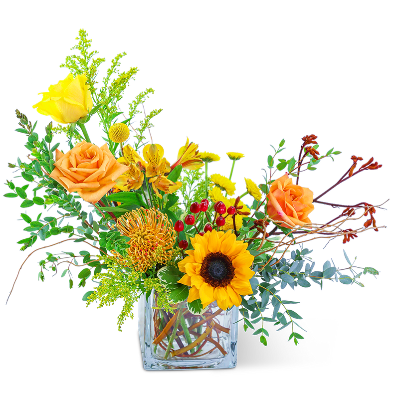 Add a modern, creative look to your home or office with our Thyme & Ginger Arrangement. These bright and colorful fall flowers are a beautiful way to welcome Autumn. Roses, Sunflowers, Pincushion Protea, Alstroemeria, and premium foliage are beautifully arranged in a clear glass vase. Inspirational and artistic, this design would be a perfect birthday or anniversary gift.
