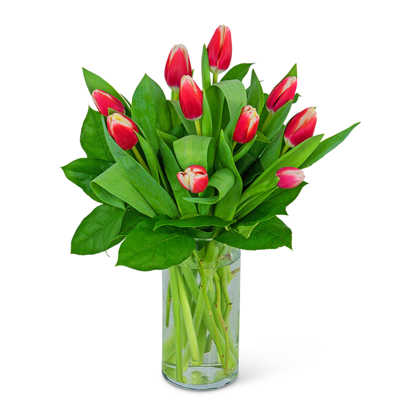 If you want to send tulips, we've got you covered! A lovely delivery of tulips is the perfect way to send spring or cheer someone up. Our Tigress Tulips is a tulip flower arrangement with a pop of bright red color, presented in a clear vase. Let someone know you're thinking of them with this stunningly beautiful bouquet.