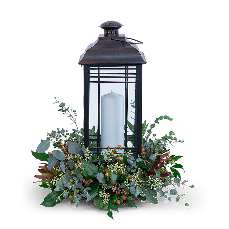 A lantern is a great keepsake for the home but is also a comforting symbol of lighting the path ahead. Tranquil Light is a customer and shop favorite, as a sympathy gift, or just because. A medium-sized metal lantern surrounded by premium foliage creates a peaceful atmosphere and serves as a beautiful keepsake for years to come. This design will look perfect in the middle of a dining or coffee table and will be a treasure to the recipient.
