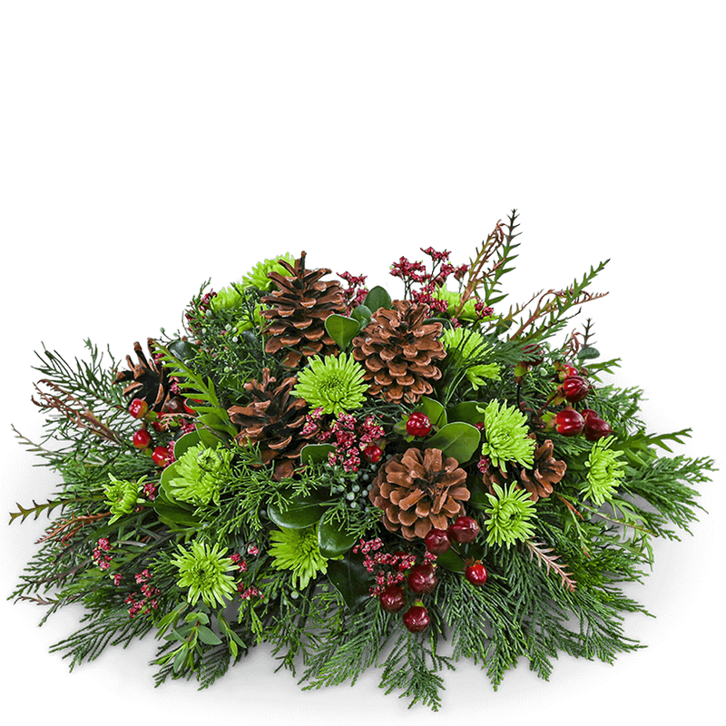Our Trimmed in Tradition Centerpiece is a lush holiday arrangement featuring Spray Mums, Hypericum Berries, Pinecones, and premium winter foliage. This festive design brings natural charm and seasonal elegance to any table. Flowers and materials may vary slightly based on availability, but the classic holiday look will be thoughtfully recreated.