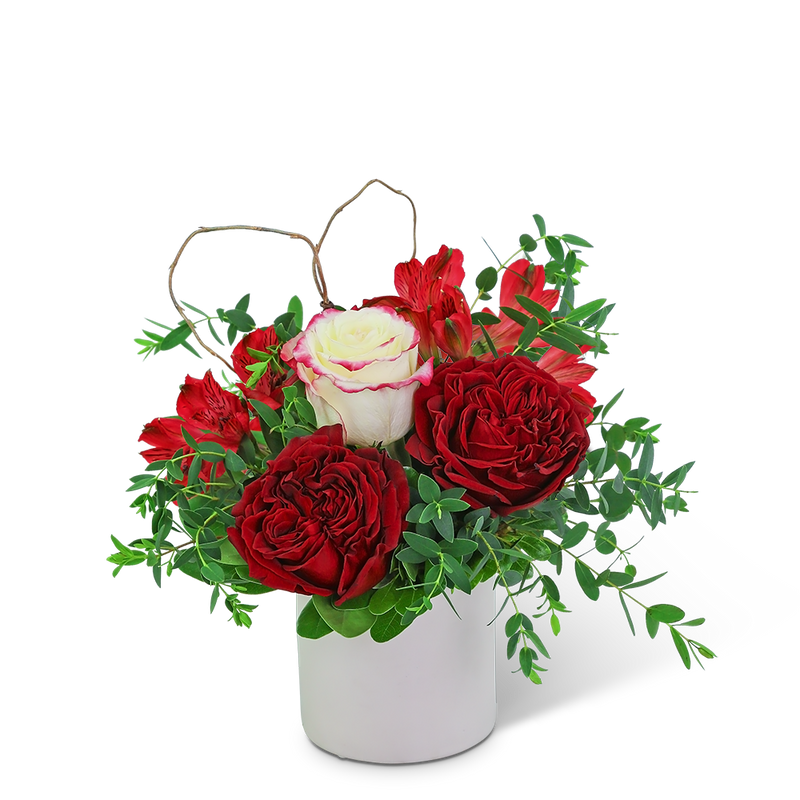 This gorgeous design is hand-arranged by our professional floral designers and delivered in an on-trend white vase. The rich, romantic colors of True Romance are sure to melt the heart of your loved one. Beautiful ruffly roses, alstroemeria, and premium foliage are artfully arranged with a natural heart accent nestled in. Flower delivery has never been easier or more appreciated. Whether you are looking for a birthday, anniversary, or valentines day gift, we have flowers that are sure to fit the occasion!