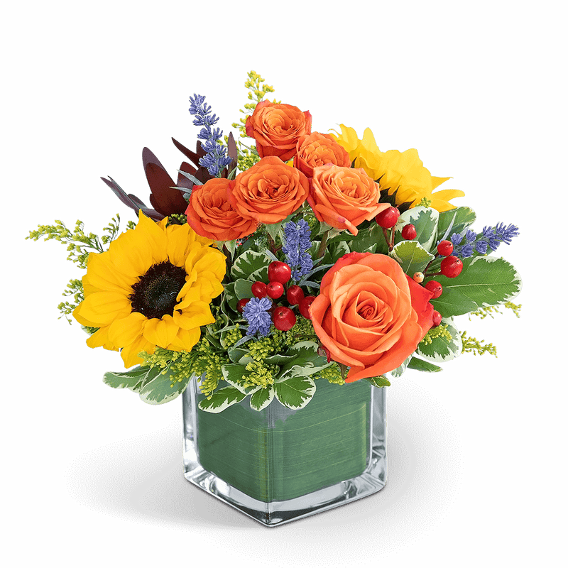 All the colors of fall are captured in Tuscan Cottage. This bright arrangement features roses, sunflowers, hypericum berry, and premium foliage. Whether celebrating a birthday, a new baby, or the beauty of fall, this bouquet will add just the right touch of warmth. This burst of colorful flowers is designed by our florist in a leaf-lined, modern glass vase to create a gift that will truly shine.