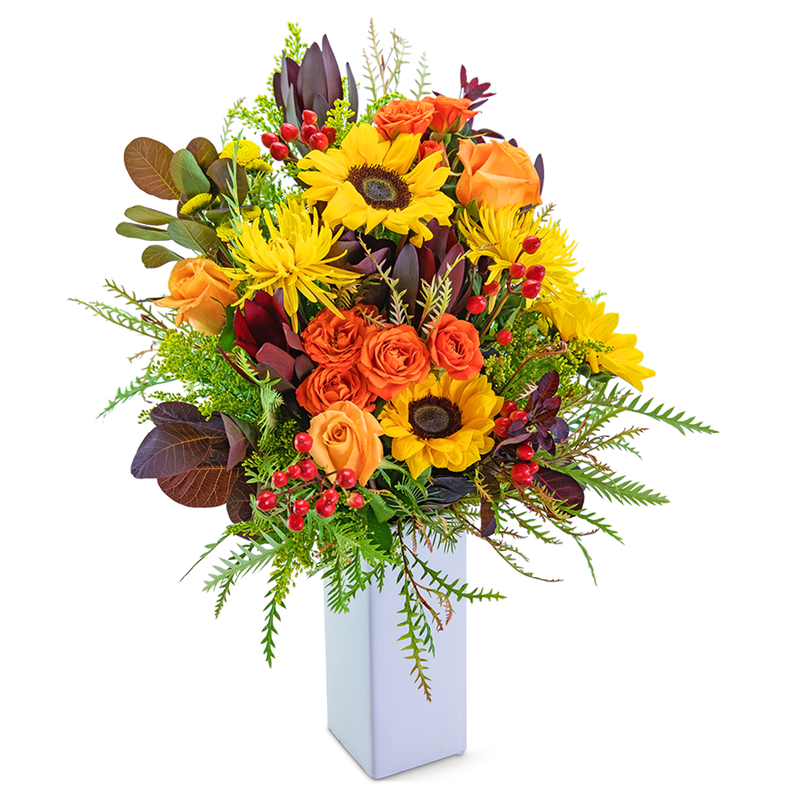 The glow of a warm Tuscan day is captured in this stunning bouquet. Tuscan Solstice features roses, sunflowers, kangaroo paw, button spray mums, hypericum berry, solidago, spider mums. leucodendron, grevelia, and variegated pittosporum. Whether celebrating a birthday, anniversary, or retirement, this tall arrangement will add just the right touch of warmth to your celebration.