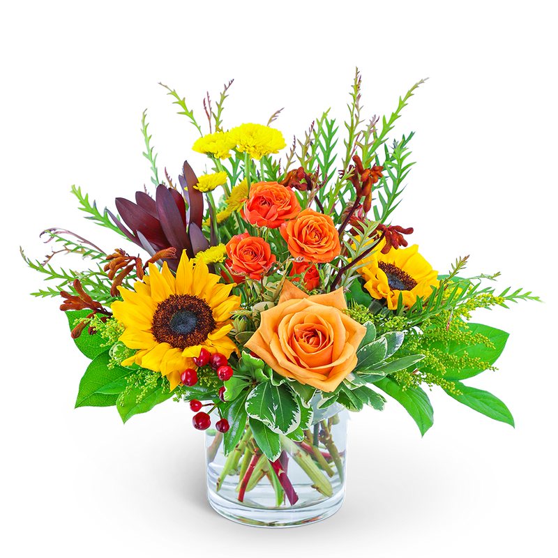 Bring a little sunshine into someone's world with our Tuscan Sun arrangement, featuring fresh Roses, Sunflowers, Mums, Hypericum Berries, and premium foliage. This beautiful bouquet is sure to put a smile on anyone's face and is the perfect birthday or get-well gift.