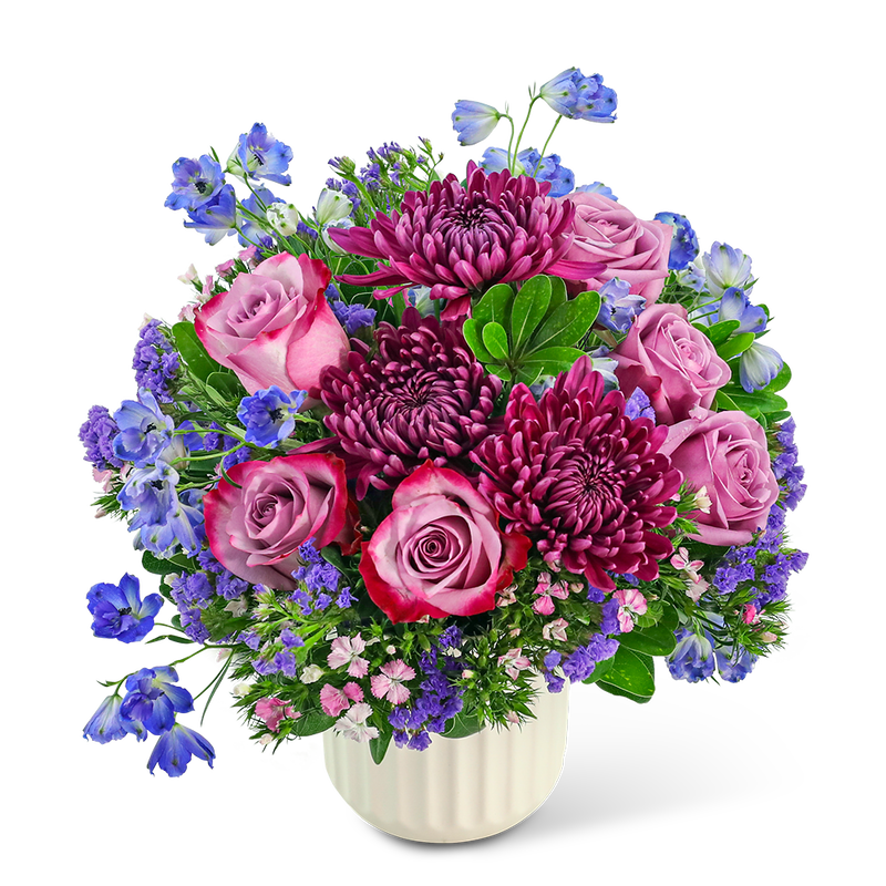 Ultraviolet Oasis is a captivating floral arrangement featuring Roses, Cremons, Dianthus, Delphinium, and premium foliage in a ceramic vase. With its vibrant purple and blue blooms, this enchanting design adds a touch of elegance to any space and is the perfectÊgift for any occasion.