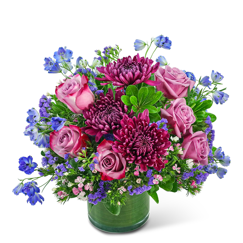 Ultraviolet Dream is a captivating floral arrangement featuring Roses, Cremons, Dianthus, Delphinium, and premium foliage in a leaf-lined vase. With its vibrant purple blooms and lush green colors, this enchanting design adds a touch of elegance to any space and is the perfectÊgift for any occasion.