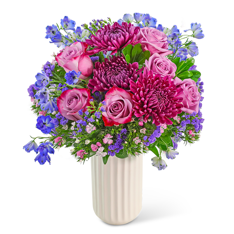 Ultraviolet Horizon is a captivating floral arrangement featuring Roses, Cremons, Dianthus, Delphinium, and premium foliage in a ceramic vase. With its vibrant purple and blue blooms, this enchanting design adds a touch of elegance to any space and is the perfectÊgift for any occasion
