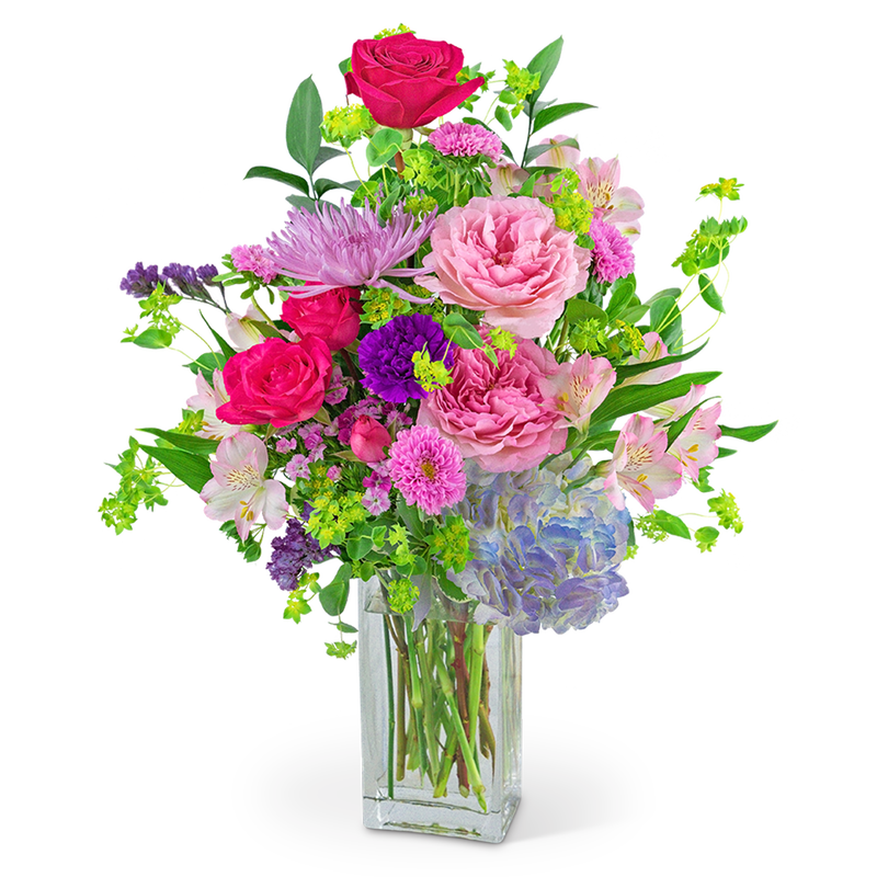 Who wouldn't love to receive this bright and blooming flower arrangement? Show your Unconditional Love with various light pink and dark pink roses, hydrangea, dianthus, carnations, alstroemeria, spider mums, and premium foliage in a clear vase. This would be a perfect gift for an anniversary, birthday, or Mother's Day and will look perfect on a Dining room table or kitchen bar.