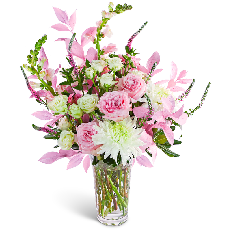 Unlimited Glow is a magical floral design exuding charm in a pink and white color palette. The exquisite pairing of roses, Cremons, Snapdragons, and glitter pink foliage creates a radiant, captivating glow. Presented in a clear glass vase, this enchanting flower design is perfect for adding sparkle to any space. Elevate the magic by arranging a flower delivery, allowing us to bring this enchanting creation straight to your doorstep. As a trusted local florist, we take pride in every order, offering hand-crafted flower designs delivered directly to the recipient. Our flower shop is committed to providing the highest quality, freshest flowers, and ensuring timely delivery for every arrangement.