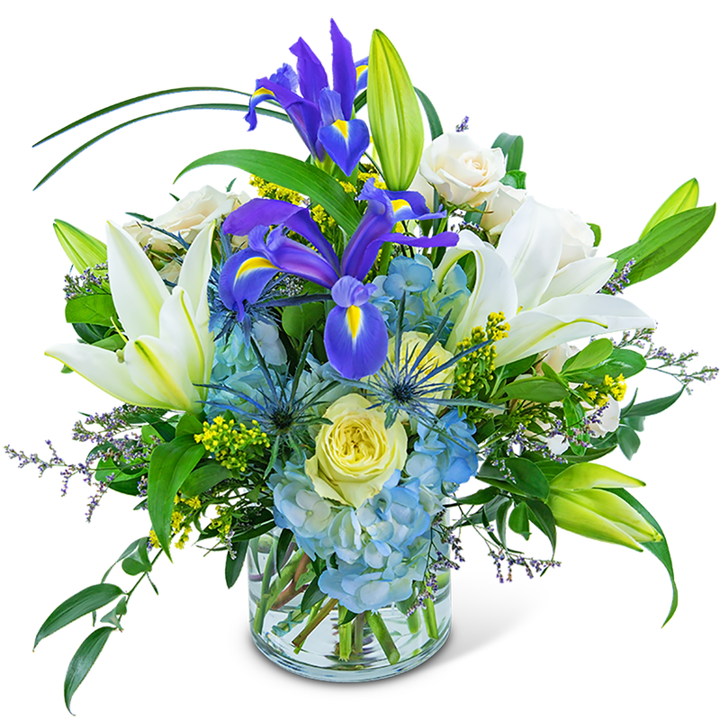 The natural beauty of these blue and white flowers speak for themselves. Untamed Beauty features blue hydrangea, white oriental lilies, blue eryngium, white roses, iris, lily grass, solidago, limonium, and Italian ruscus. This stunning arrangement is perfect for a birthday or anniversary and will add a touch of beauty to any room.