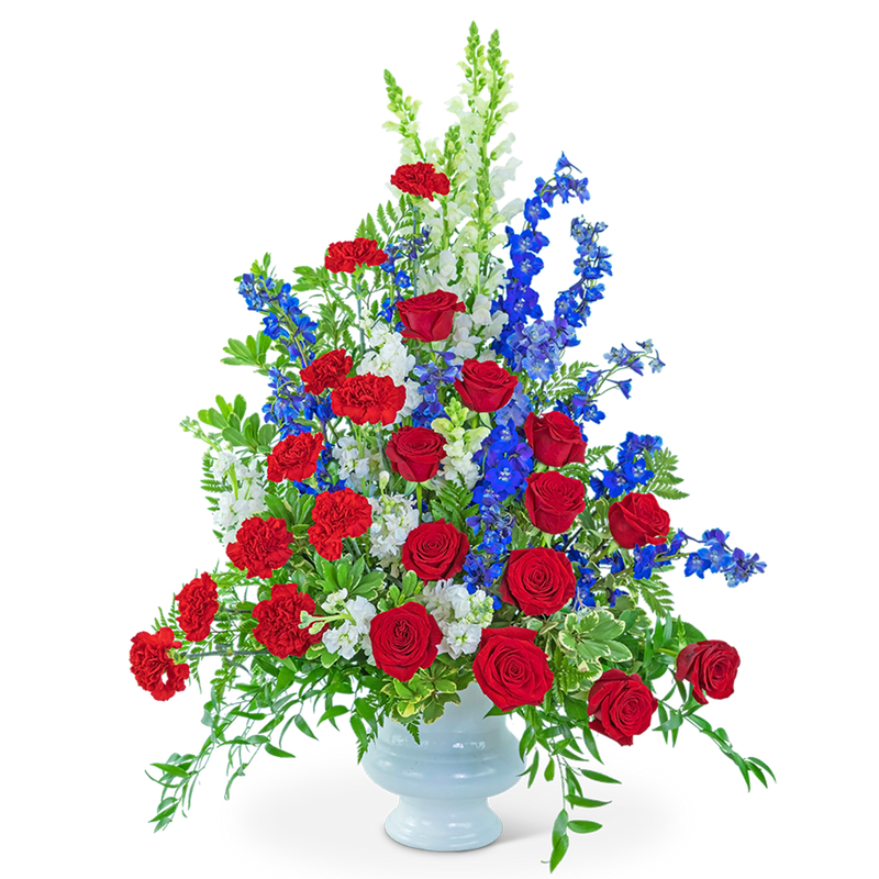 This beautiful red, white, and blue design honors the valiant effort of the ones who served our country with honor. It is filled with red roses and carnations, blue delphinium, and white snapdragons surrounded by a variety of premium foliage. The Valiant Honor Urn is the perfect sympathy arrangement to send to a funeral or to a grieving family to let them know their loved one will never be forgotten.