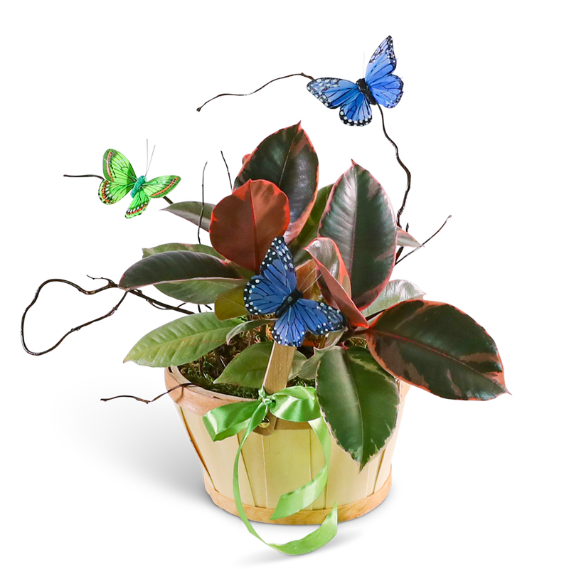 The Variegated Rubber Tree Plant with Butterflies is a striking houseplant known for its bold, colorful foliage and low-maintenance care. Renowned for its air-purifying qualities, this hardy plant thrives in bright, indirect light and adds a tropical touch to any space. We've added a few butterfly and willow accents to bring in a delightful touch of nature, enhancing its beauty and charm. As a trusted local florist, we take pride in every order, offering fresh plants delivered directly to the recipient. Our flower shop is committed to providing the highest quality, freshest flowers and plants, and ensuring timely delivery.