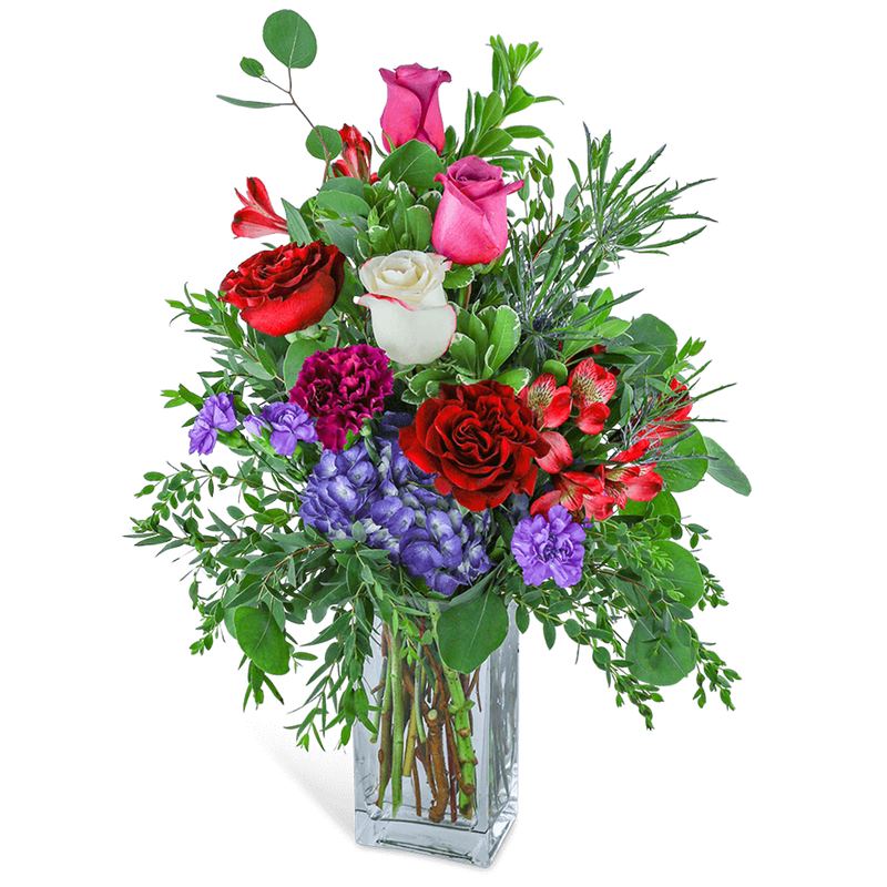 Velvet Jewel is a classic bouquet composed of Roses, Alstroemeria, Carnations, Eryngium, and premium foliage artfully designed in a clear vase. Its stylish and elegant jewel tones will bring a touch of romance to any room. Rich colors and romantic beauty make this an ideal gift to send for Valentine's Day, an anniversary, or any day you want to show your love.