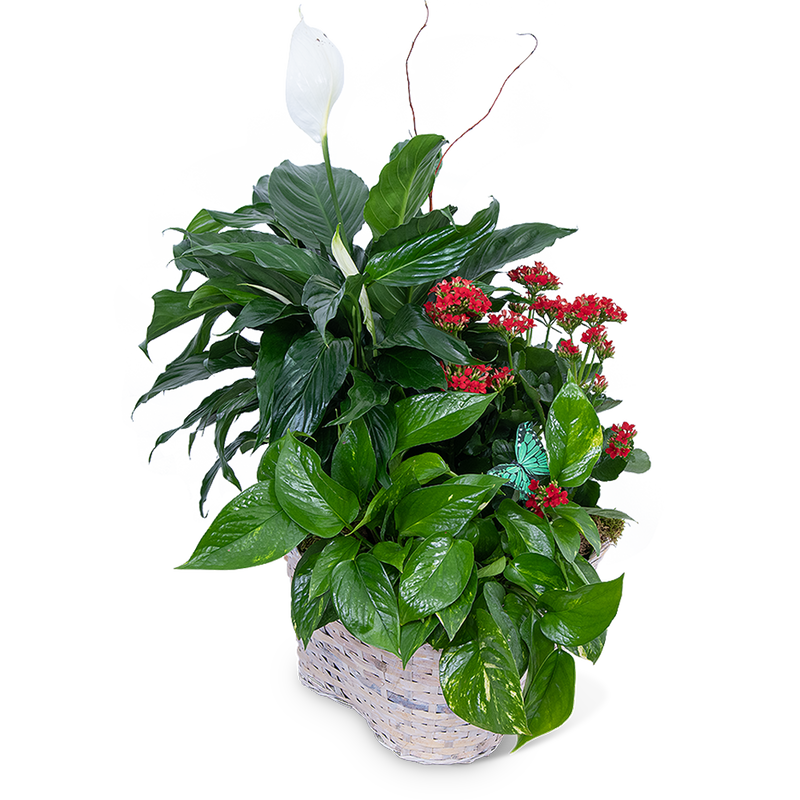 Studies have proven that having plants in your home boost your mood and your health. Send your love with our Verdant Basket! This low-maintenance beauty features a Kalanchoe, Pothos, and a Peace Lily Plant, nestled together in a large basket. This gift is both easy to care for, decorative, and is also great for purifying the air, so place your order today for this stylish favorite!