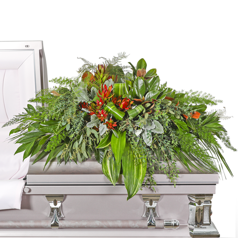 The Verdant Farewell Casket Spray evokes a sense of tranquility with its lush display of verdant greenery, offering a serene tribute to the memory of a loved one. The rich, deep greens of the foliage symbolize enduring memories and a life well-lived, creating a comforting and graceful presence at the final farewell. The casket flowers are typically provided by the family of the deceased as a heartfelt memorial from the family and are designed to sit on the lid of the casket for a funeral service or memorial.