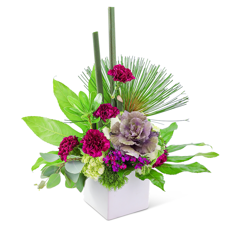 The Verdant Reign flower bouquet is a stunning gift for any occasion and is a very popular choice! This elegant and modern design features Carnations, Kale, Hydrangea, Dianthus, and premium foliage. It's the perfect accent for an end table, coffee table, or desk and will brighten any room. This spectacular arrangement is hand-designed by our expert florists in a white ceramic cube.