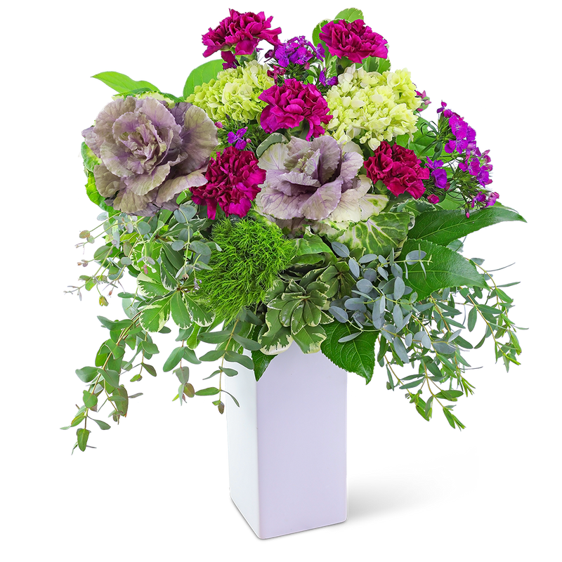 The Verdant Waterfall flower bouquet is a stunning gift for any occasion and is a very popular choice! This elegant design features Carnations, Kale, Hydrangea, Dianthus, and premium foliage. It's the perfect accent for a dining table and will brighten any room. This spectacular arrangement is hand-designed by our expert florists in a stunning white vase.