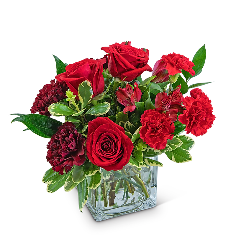 This bouquet of all red blossoms is a very sweet gift! Very Cherry features roses, alstroemeria, carnations, and various foliage in a clear cube. This piece will add just the right touch of color to any side table or desk.