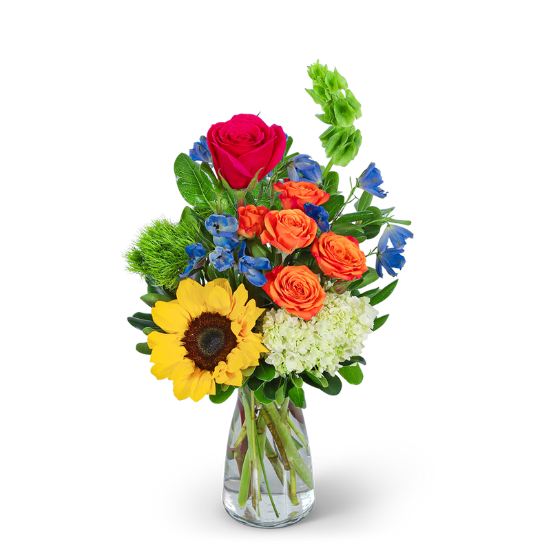 A mother's love is like a radiant sun, casting its vibrant rays of unconditional care and support upon our lives. Our Vibrant As Your Love design is an explosion of bright, bold colors that will infuse any space with energy and joy. This bright flower arrangement showcases a kaleidoscope of hues from the rainbow, featuring a mix of sunflowers, roses, hydrangeas, delphiniums, bells of Ireland, green trick dianthus, and lush foliage. It will make the perfect Mother's Day gift and will leave a lasting impression.