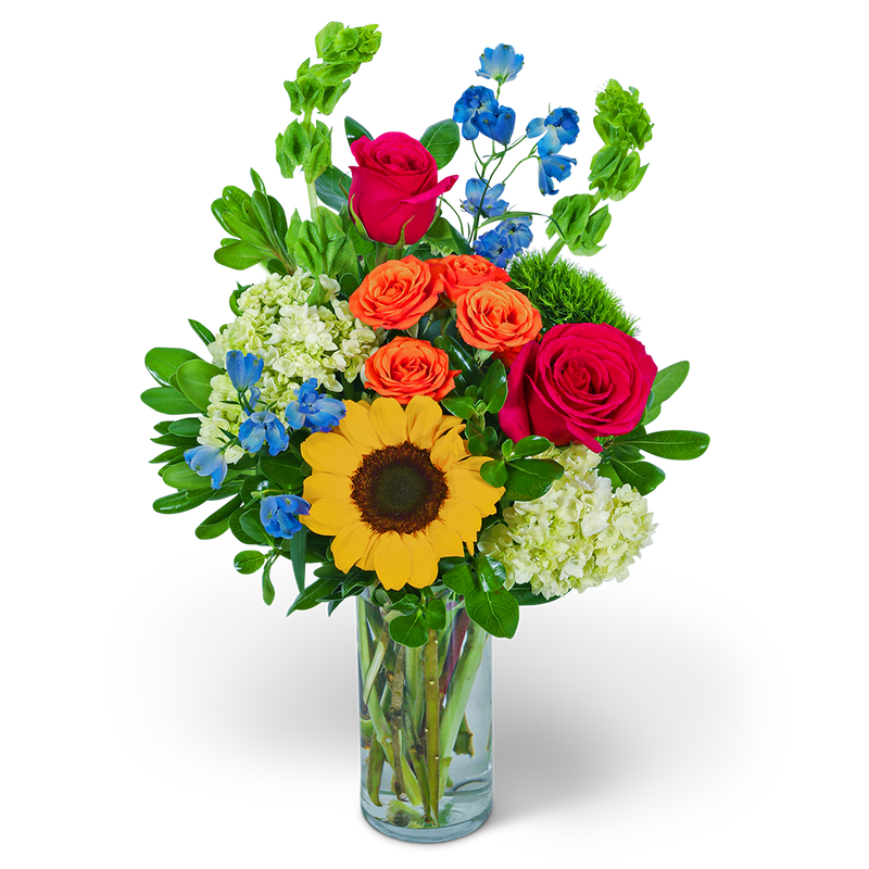 A mother's love is like a radiant sun, casting its vibrant rays of unconditional care and support upon our lives. Vibrant Expression of Our Bond is an explosion of bright, bold colors that will infuse any space with energy and joy. This bright flower arrangement showcases a kaleidoscope of hues from the rainbow, featuring a mix of sunflowers, roses, hydrangeas, delphiniums, bells of Ireland, green trick dianthus, and lush foliage. It will make the perfect Mother's Day gift and will leave a lasting impression.