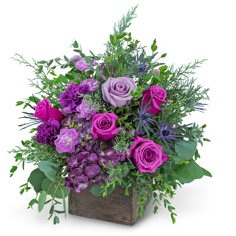 The feeling of a crisp winter day is captured in the rich colors of this arrangement. Violet Enchantment contains Hydrangea, Roses, Carnations, Eryngium, Parvifolia, and Silver Dollar Eucalyptus surrounded by Evergreen and displayed in a rustic wooden box. This colorful piece will be perfect on an entry or dining table.