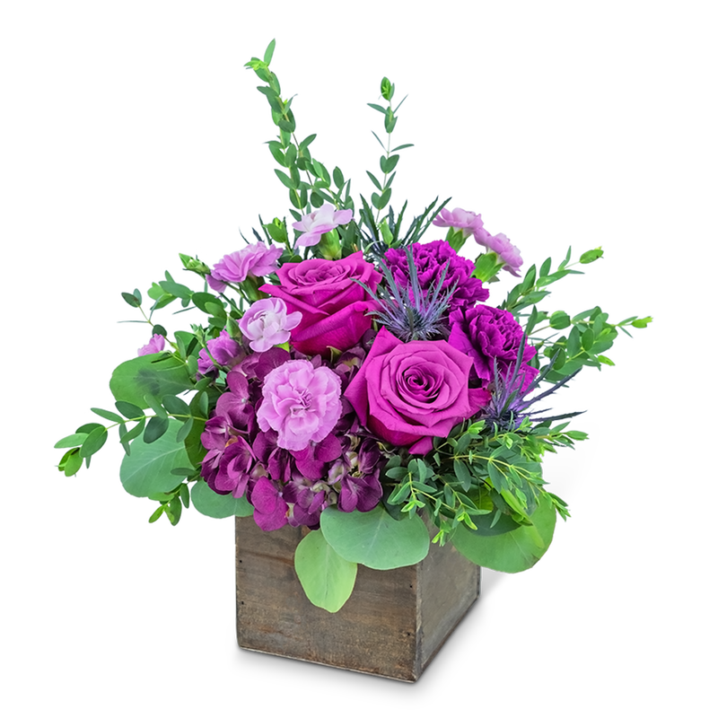 With a variety of rich purples, this arrangement is as stylish as its namesake. Violeta features hydrangea, roses, carnations, and premium foliage including Silver Dollar Eucalyptus, displayed in a rustic wood box. This bouquet is a stunning gift for any occasion!