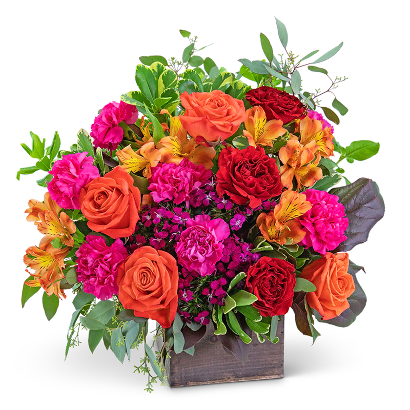 Nothing is more full of life than this design. Viva Panama is a vibrant collection of Myra and orange roses, carnations, alstroemeria, and dianthus accented with a variety of foliage in a modern wooden box. This large, colorful arrangement would make quite a statement on an entryway or dining room table.