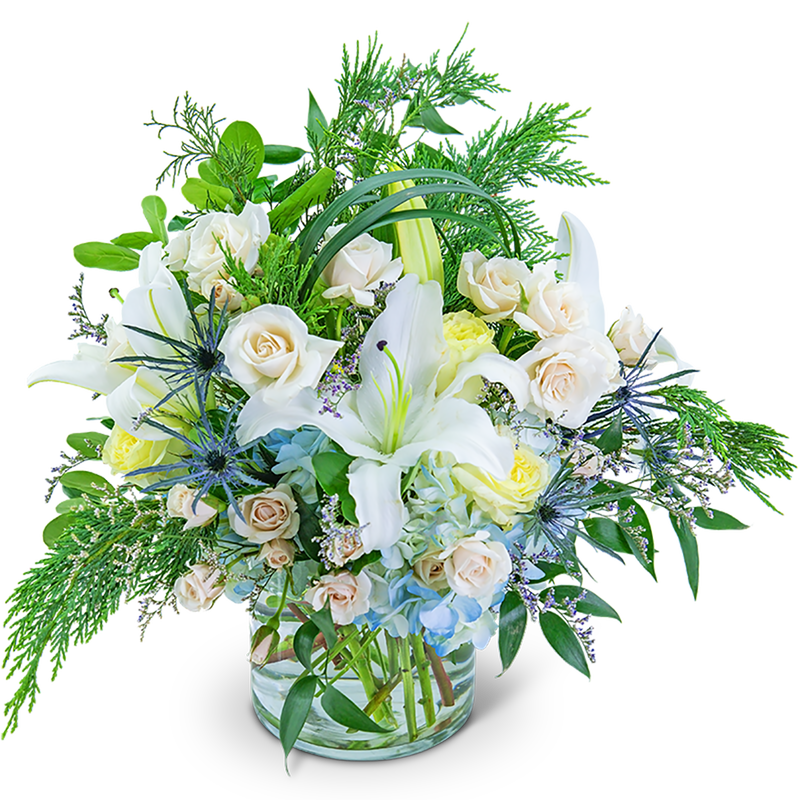 Bring a little joy into someone's life with this cheerful bouquet! Warm and Joyful features blue hydrangea, white oriental lilies, blue eryngium, white roses, lily grass, evergreen, limonium, pittosporum, and Italian ruscus in a clear glass vase. Whether for a birthday, anniversary, or thinking of you gift, this will look perfect on an entryway or dining room table.