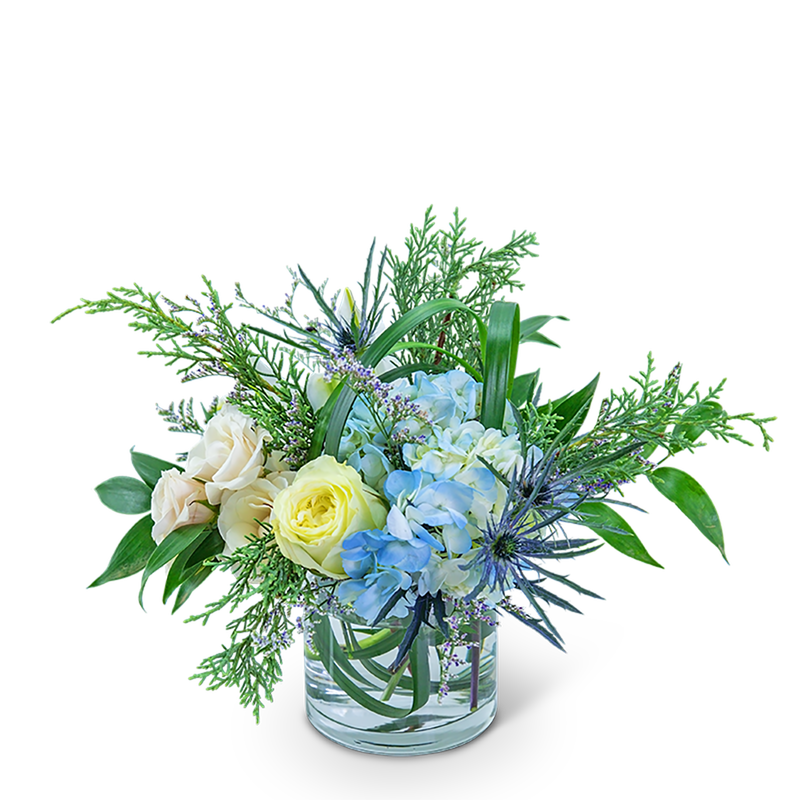 Let someone know how much you care with the gift of Warm Hearted. This beautiful arrangement combines blue hydrangea, white roses, blue eryngium, lily grass, evergreen, limonium, and Italian ruscus in a clear glass vase. Whether for a birthday, new baby, or thank you gift, this will look perfect on a side table or desk!