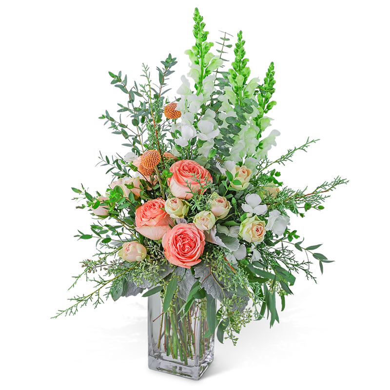 This stunning piece will add a touch of whimsy to any one's life! Whimsical Winter Wish contains Roses, Snapdragons, Carnations, Crespedia, Dusty Miller, and Parvifolia surrounded by Evergreen and displayed in a tall clear vase. This arrangement will look perfect on any entry or dining table.