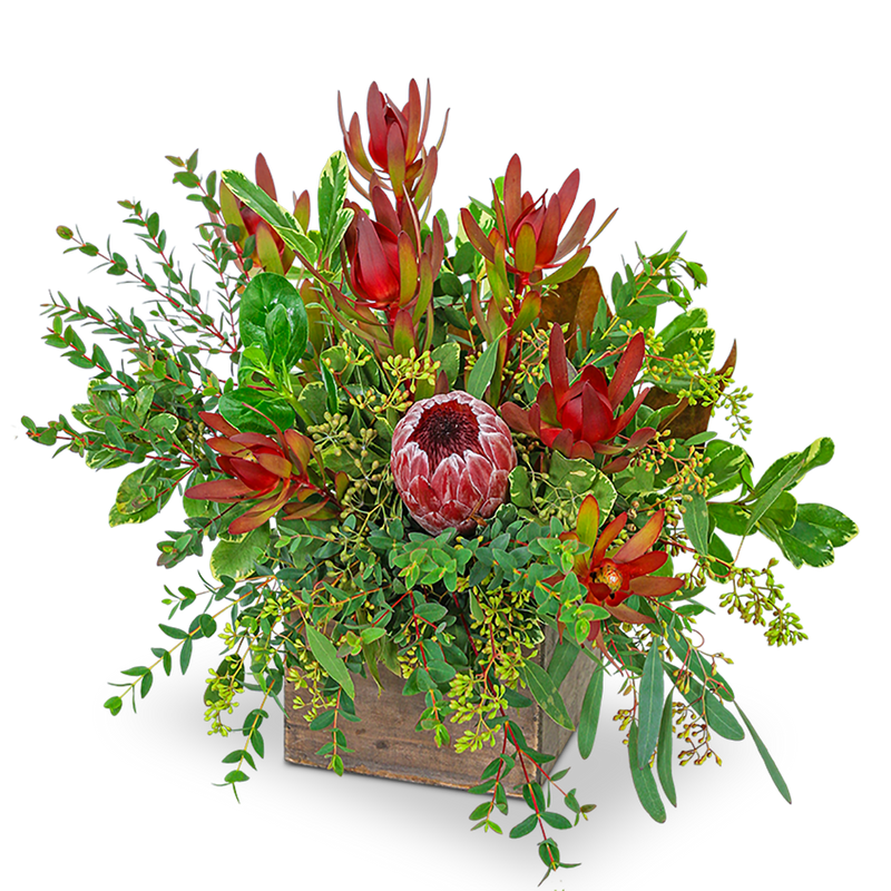 Introducing our Wild and Lush Protea arrangement, a stunning display of unique and exotic protea and leucadendron flowers accented with premium foliage. These bold blooms are arranged in a rustic wooden box for a touch of natural charm. This arrangement is perfect for anyone who appreciates the beauty of the unexpected and loves to stand out from the crowd. With its striking colors and textures, it's sure to be a conversation starter wherever it's displayed.