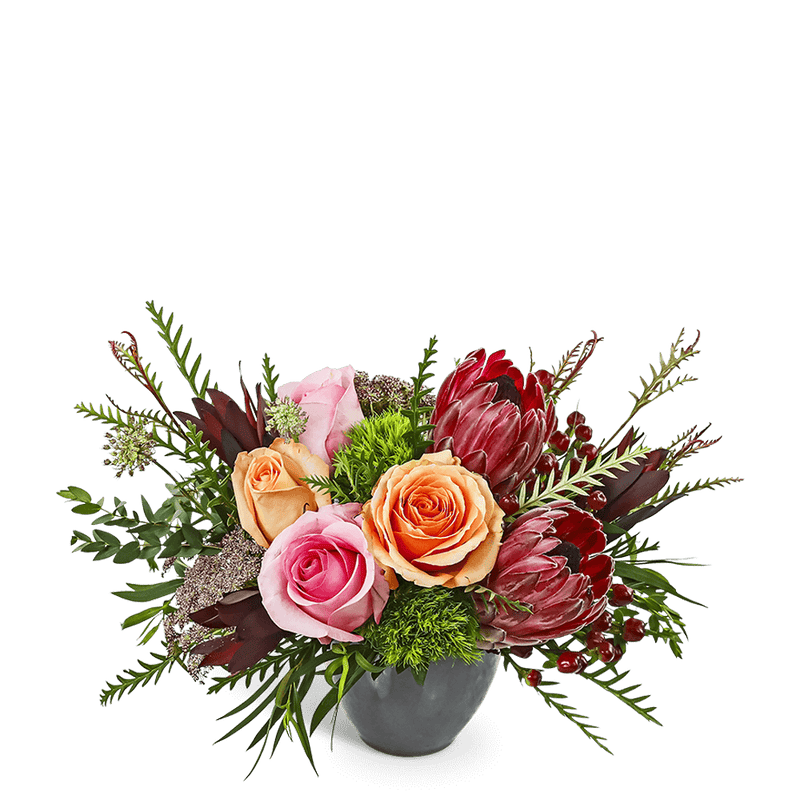 Wild Rose Waltz is a striking, high-end flower arrangement featuring Protea, Roses, Berries, and unique accent flowers with premium foliage. Designed in a granite-colored vase, it's perfect for birthdays, thank yous, or anytime you want to send a luxurious flower delivery. Our floral designer may make thoughtful substitutions while maintaining the overall look of the arrangement.