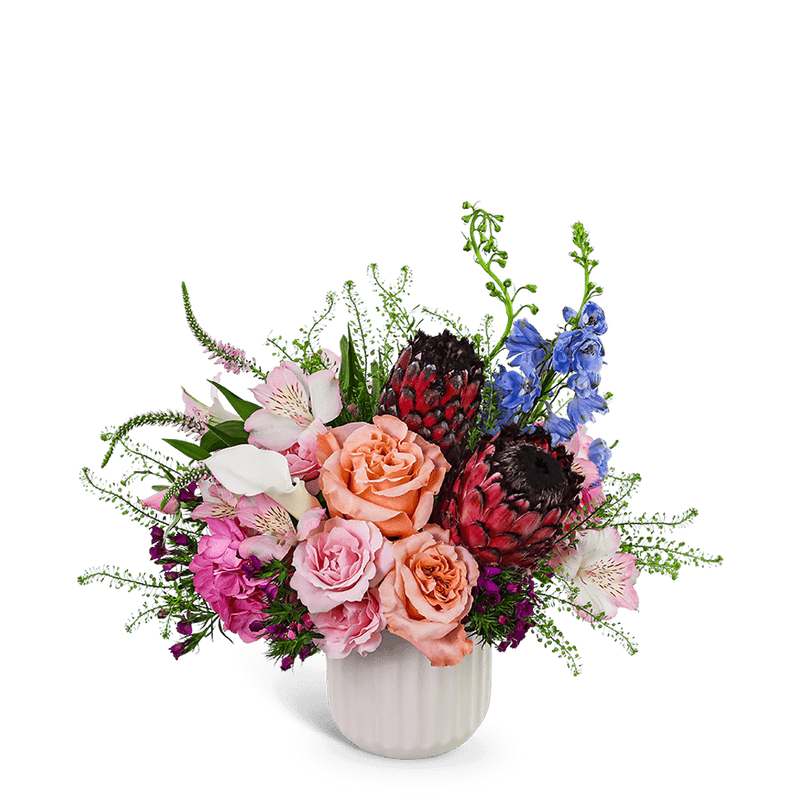 Wildflower Jewel is a luxe and colorful arrangement featuring Roses, Protea, Calla Lilies, Delphinium, and other seasonal accent flowers. Designed in a white ceramic vase, it's perfect for birthdays, congratulations, or a special flower delivery just because. Our floral designer may make thoughtful substitutions while maintaining the overall look of the arrangement.