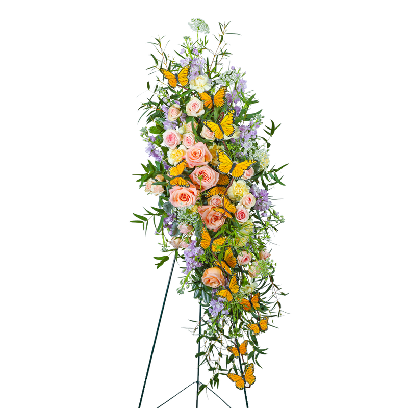 The Wind Beneath My Wings Standing Spray is a vibrant memorial spray adorned with a delicate design of pinks, yellows, purples, and fluttering butterflies, symbolizing a graceful farewell. The harmonious blend of colors and elegant butterflies creates a serene and beautiful tribute, honoring the memory of a loved one with both warmth and serenity.