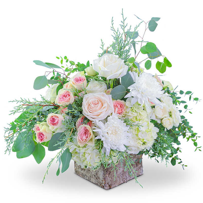 Awaken the senses as you walk into your own romantic floral fantasy! Traditional roses, contemporary mums, and playful hydrangea mix to create a stunning bouquet! Wintry Birch Blooms is bursting with blossoms and arranged in an eye-catching birch cube, accented with premium foliage. A shop favorite, this timeless beauty is perfect for any occasion!