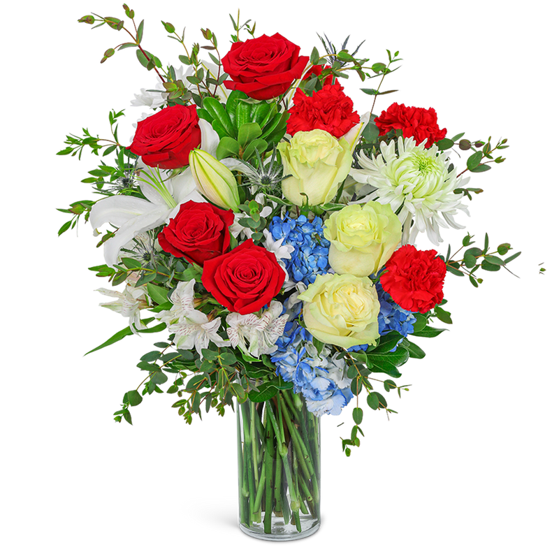 Celebrate the honor and pride of your loved one with our stunning floral arrangement, With Pride and Honor. Featuring a vibrant and patriotic red, white, and blue color scheme, this arrangement includes gorgeous hydrangea, roses, carnations, lilies, mums, alstroemeria, and other premium foliage. Whether you're sending condolences, honoring a veteran, or simply showing your appreciation, With Pride and Honor is the perfect way to express your love and respect.